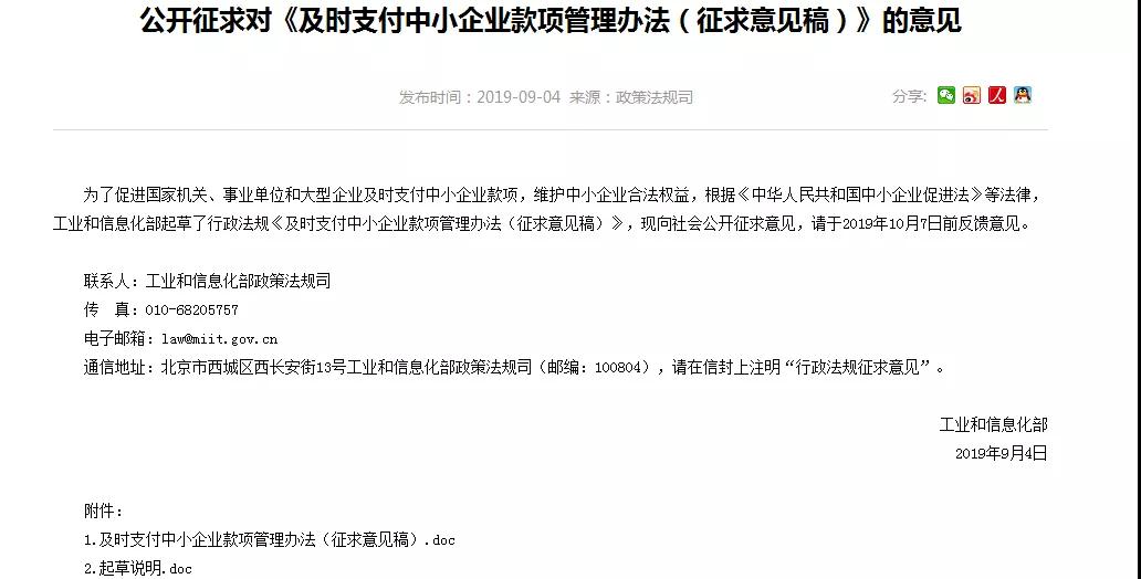 2019年9月,工信部發(fā)布《及時(shí)支付中小企業(yè)款項(xiàng)管理辦法(征求意見稿)》,提出: